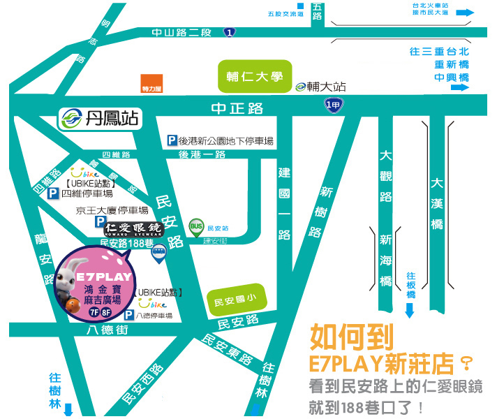 | 「丹鳳站2號出口」走進民安路>看到仁愛眼鏡就到188巷口>右轉就會看到E7PLAY招牌就是了 |