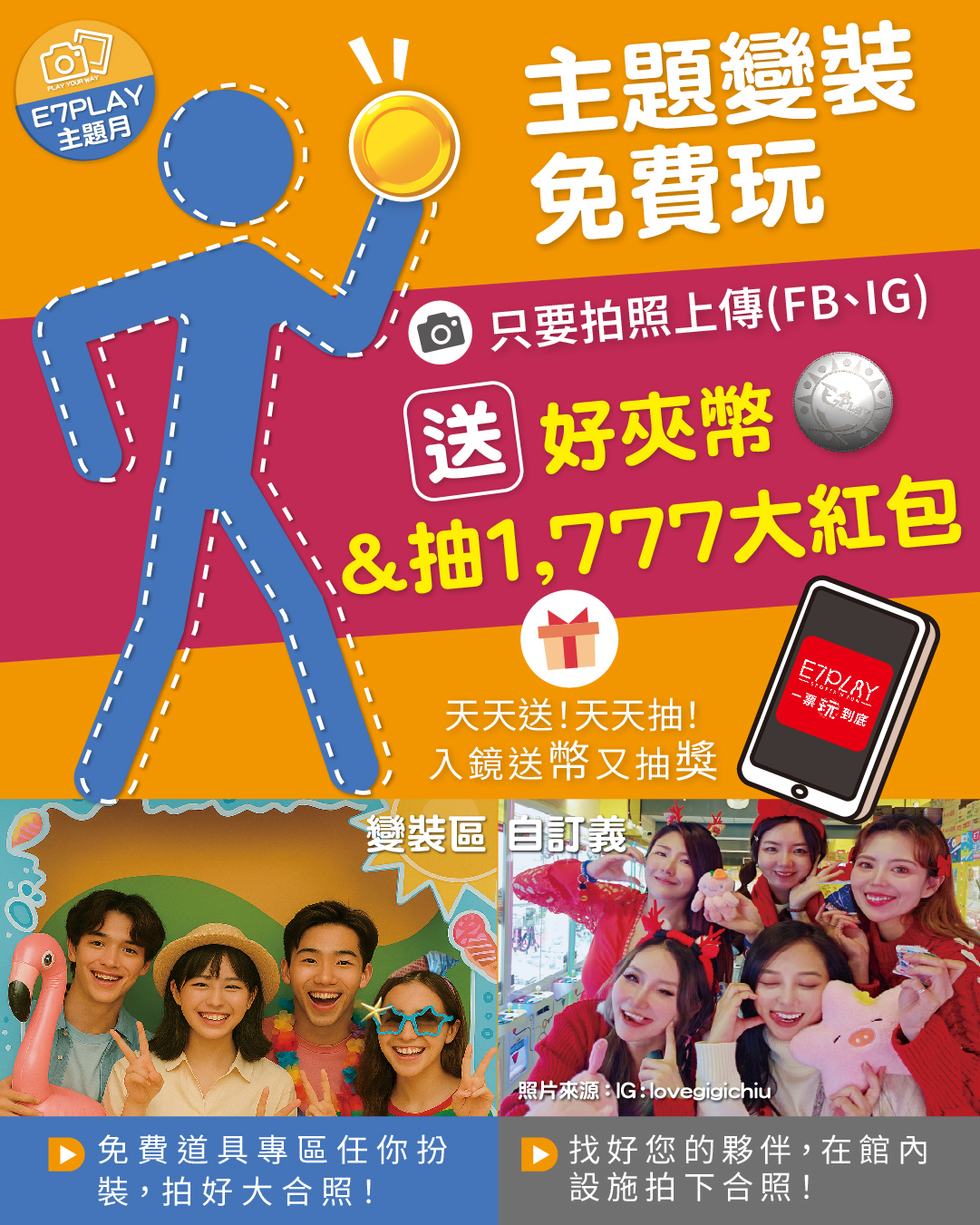 帶有dresscode主題穿搭到館 #最玩星 專屬主題拍照區 #最亮星 ➤ 沒有靈感人來就好!E7主題月的驚喜不間斷!每月換上不同主題,提供免費道具專區讓你穿戴,好拍好玩不用花錢買道具~快集合大合照上傳抽獎換好夾幣去!
