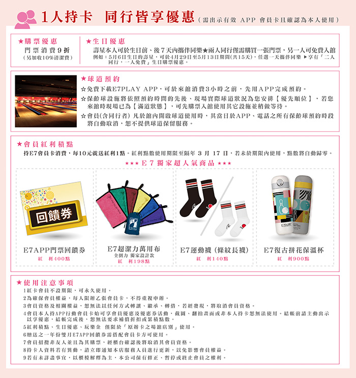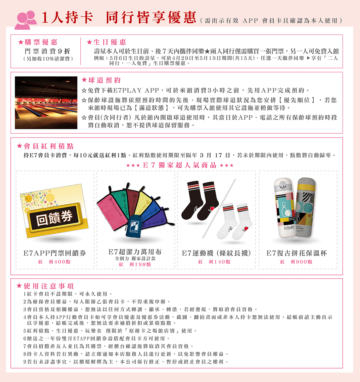 只要您到E7消費2次(3個月內集滿2章),就能用E7 APP免費申辦為紅卡會員►除了同行友人皆能享有門票折扣優惠外,還能享有生日同樂禮:2人進館1人免費、消費可累積紅利點數兌換商品、球櫃租賃等優惠…獨享權益。