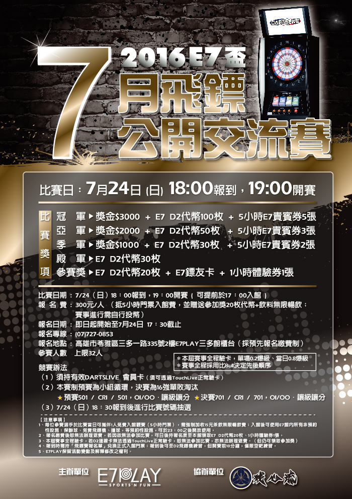 E7盃飛鏢交流賽七月賽事,準備開戰囉! 時間:2016/7/24(星期日),晚上7點 報名費:300元(贈代幣20枚、飲料、E7體驗券) 獎項:冠軍3千、亞軍2千、季軍1千、殿軍代幣20枚 賽制:小組循環+16強單敗淘汰,OI/OU 比賽開打之前想練手感,想知道自己的實力到什麼層次嗎?快來找魔王練習不就知道了嗎?魔王一字排開,任你選擇的啦!