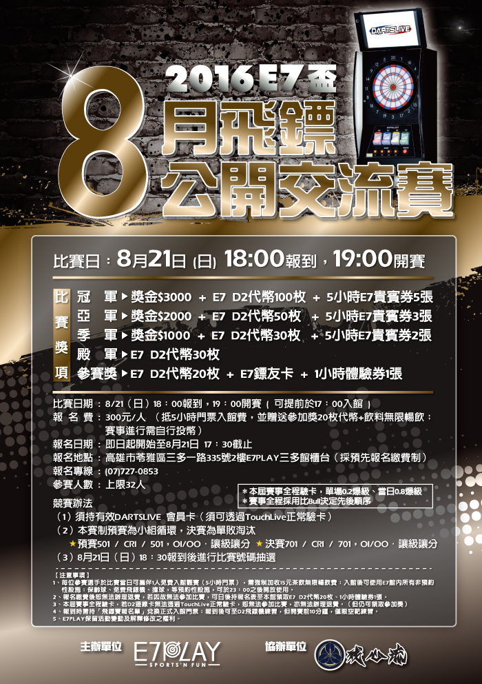 E7盃飛鏢交流賽八月賽事,準備開戰囉! 時間:2016/8/21(星期日),晚上7點 報名費:300元(贈代幣20枚、飲料、E7體驗券) 獎項:冠軍3千、亞軍2千、季軍1千、殿軍代幣20枚 賽制:小組循環+16強單敗淘汰,OI/OU 比賽開打之前想練手感,想知道自己的實力到什麼層次嗎?快來找魔王練習不就知道了嗎?魔王一字排開,任你選擇的啦!