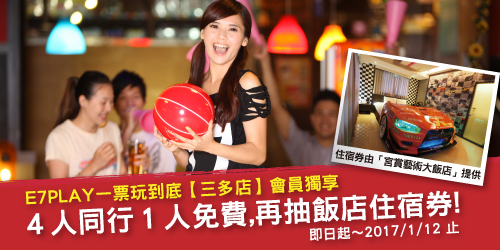 ◎會員優惠辦法說明:凡於上述優惠活動期間,持E7PLAY會員卡至高雄三多館購買門票,即可享有「4人同行1人免費」之門票優惠,每張會員卡單日限使用優惠乙次;唯2016/12/31~2017/1/2跨年連假期間恕無法無用本優惠。本會員卡優惠活動之「第4人免費對象」將以同行者之中票價最低者為準;且本優惠恕無法與其他優惠活動或票券同時使用。