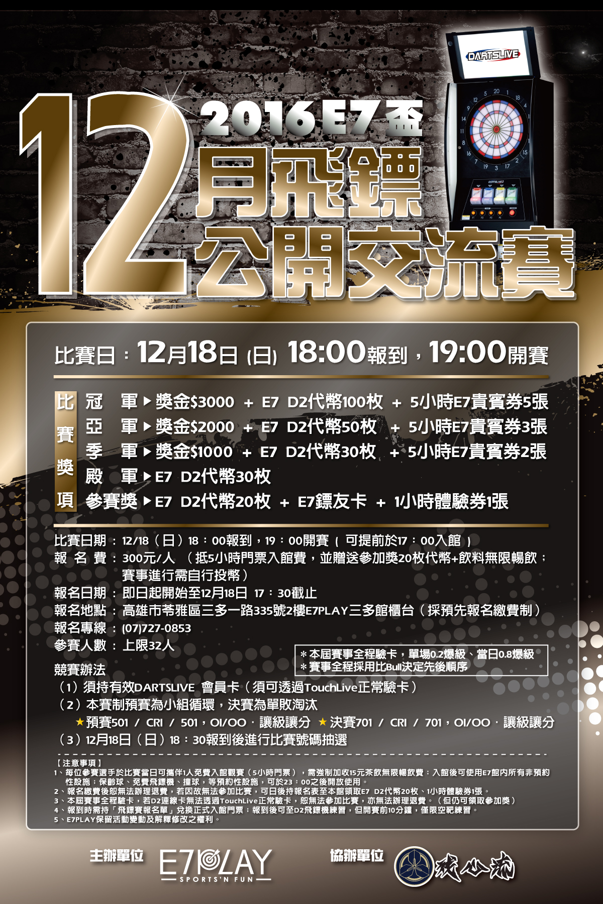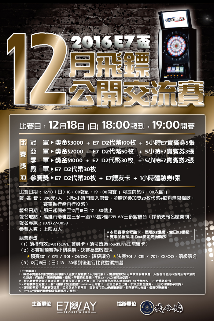 E7盃飛鏢交流賽十二月賽事,準備開戰囉! 時間:2016/12/18(星期日),晚上7點 報名費:300元(贈代幣20枚、飲料、E7體驗券) 獎項:冠軍3千、亞軍2千、季軍1千、殿軍代幣30枚 賽制:小組循環+16強單敗淘汰,OI/OU 比賽開打之前想練手感,想知道自己的實力到什麼層次嗎?快來找魔王練習不就知道了嗎?魔王一字排開,任你選擇的啦!