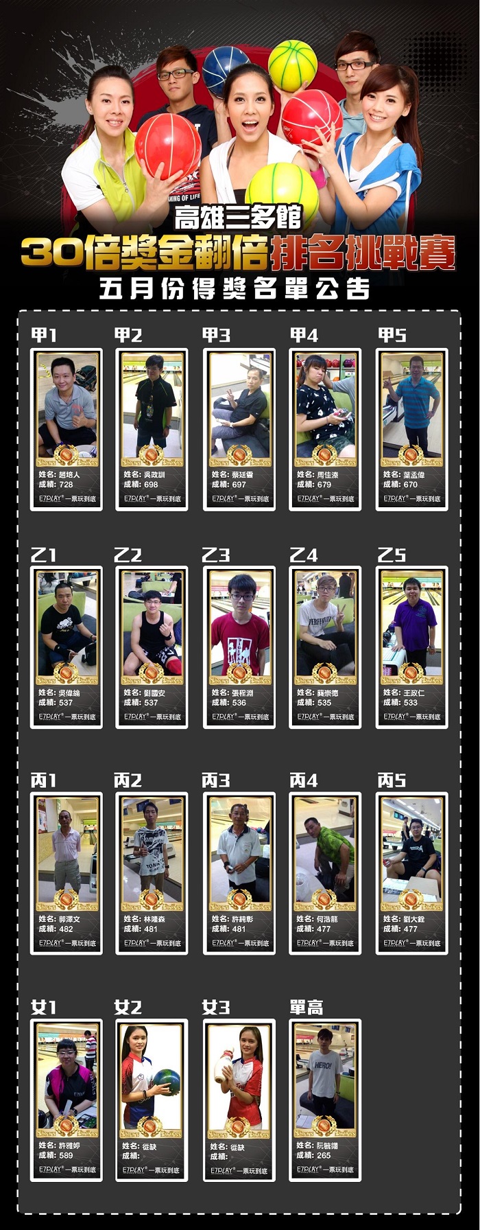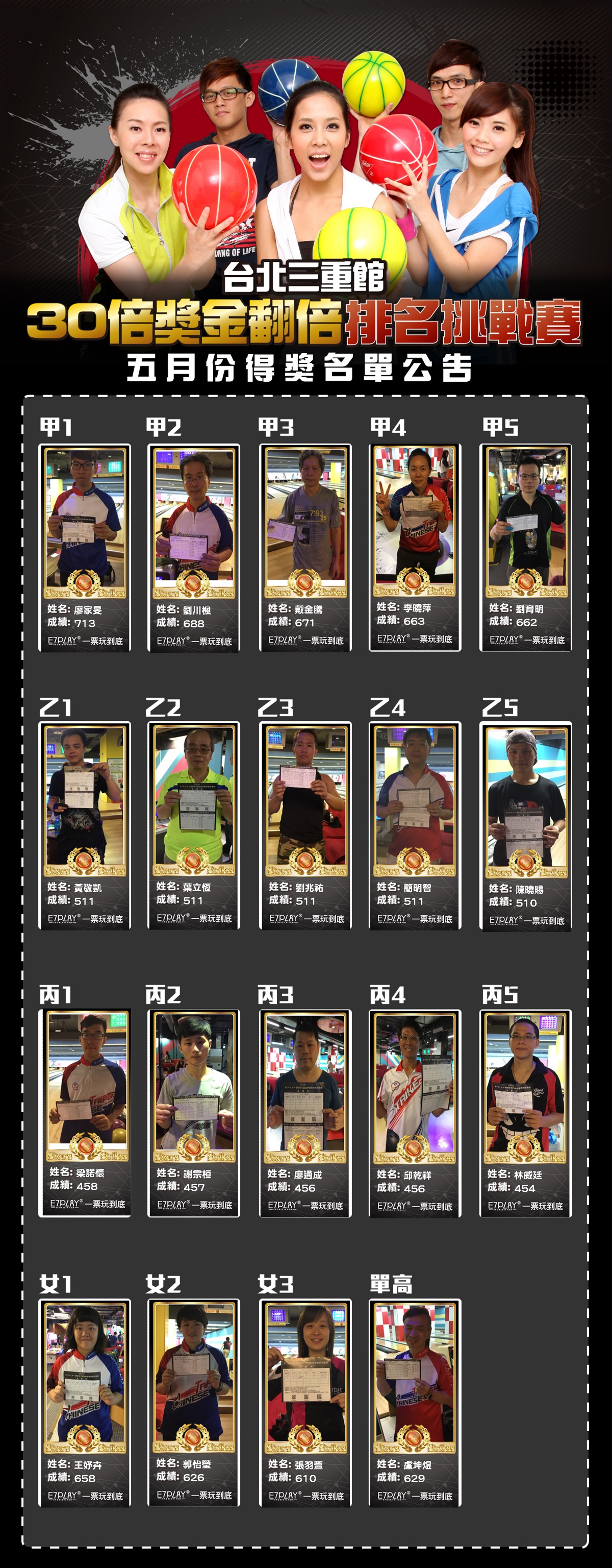 【三重/三多】E7PLAY保齡球30倍獎金排名挑戰賽5月份得獎公告!