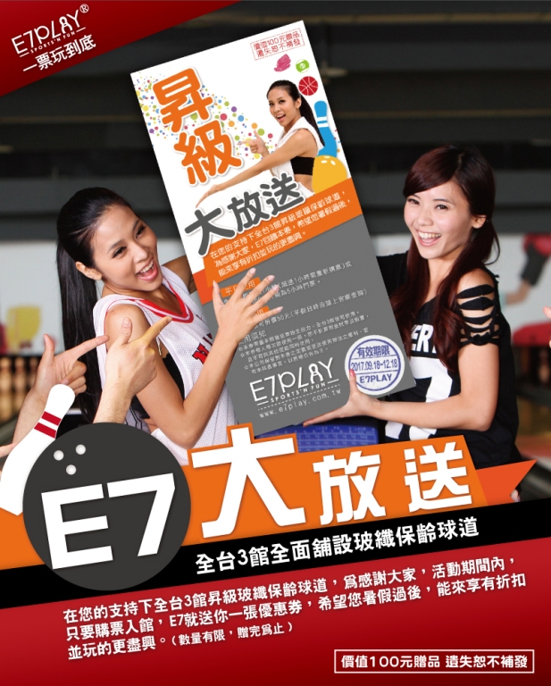 E7三館通算72球道完全進化『玻纖球道』! 這麼一個值得慶祝的時候,怎麼可以不跟全台灣的E7好朋友分享呢? 即日起來E7消費,就會送你一張「昇級大放送」優惠券喔!在9/18之後來館使用本券,即可享有「免費玩1小時」或是「加100元玩5小時」的優惠喔!