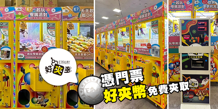 出手夾取您喜愛的小吃、飲料、吊飾,只要購票進館,即可憑票獲贈好夾幣,想吃想喝什麼下爪吧!是不是聽起來很令人興奮?小孩喜歡的童趣軟糖、女友愛喝的果汁飲品,打工族的乙方最需要的能量飲料,E7週週更換不同品項。