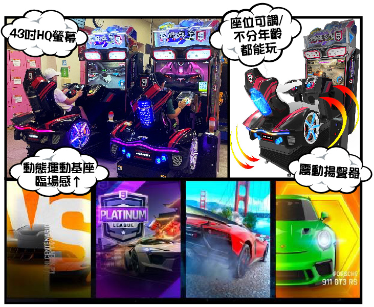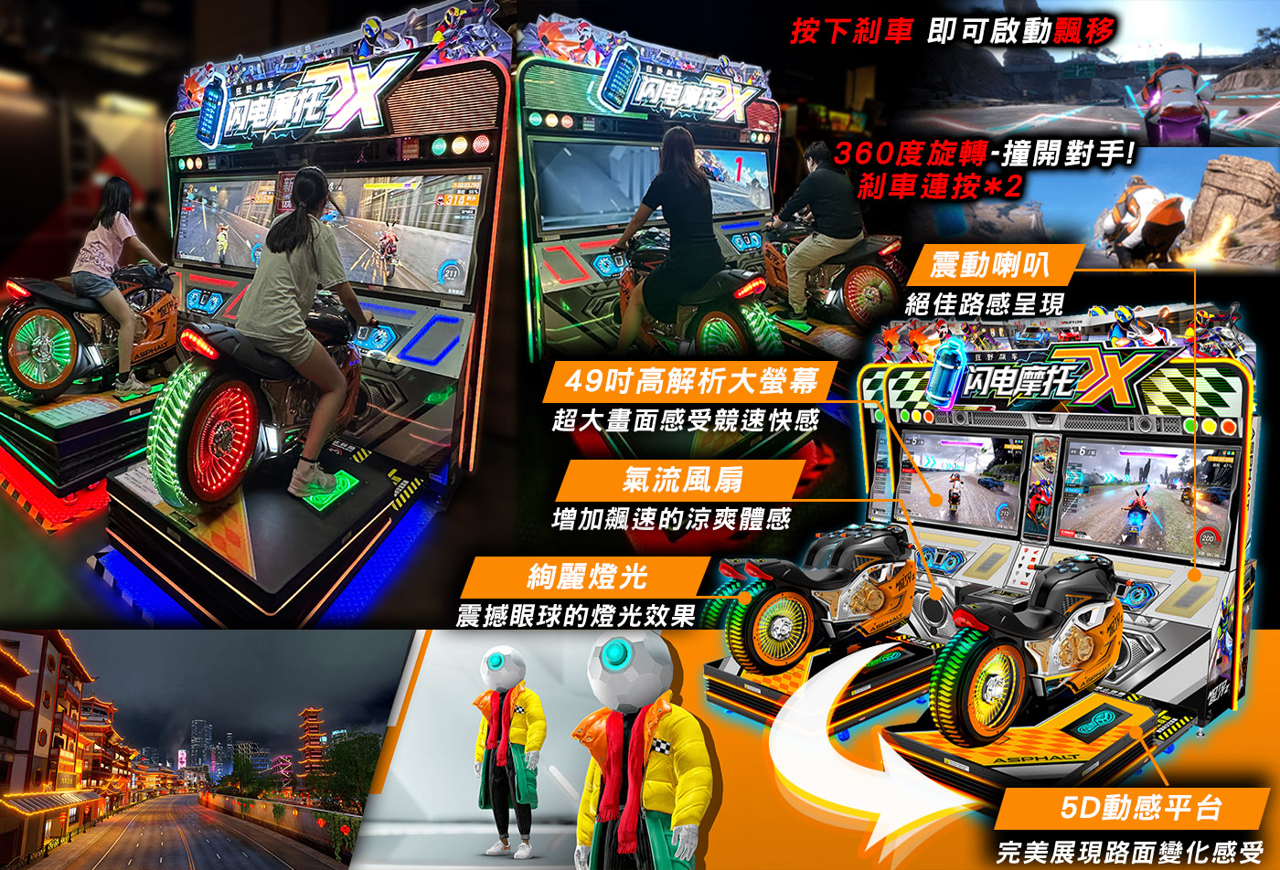 這款有著49吋高解析大螢幕及體感震動裝置,也搭配有氣流風扇壯志讓玩家體驗更真實刺激的重機競賽。也是可以免費玩得不用懷疑:)  征服世界知名場景賽道,透過飛躍跳台及旋轉破壞對手累積能量,釋放氮氣衝刺體驗無上的速度快感,遊戲中可與知名超跑NPC對決、或穿梭拱門挑戰成就,不管是親子輕鬆遊玩還是三五好友對戰比拚,都能享受到獨一無二的快樂體驗。