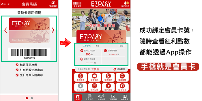 紅卡會員獨享! 成為紅卡會員,門票終身享 9 折,還有生日禮等著你!原本有實體卡的玩家,也能在 APP 內一鍵綁定,用手機代替實體卡,所有優惠隨時查閱,方便又快速! 現在就下載 APP,讓你的 E7 玩樂體驗更加分!