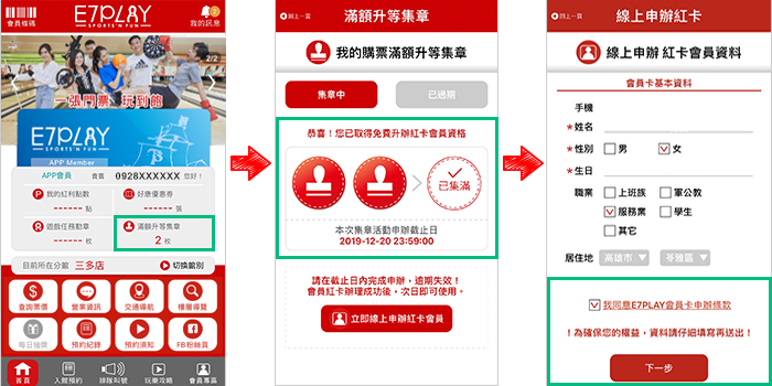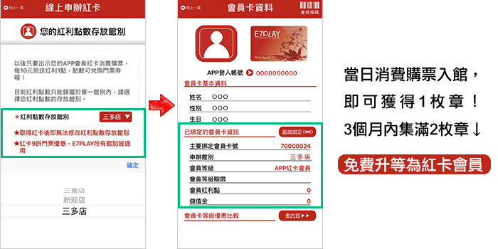 免費下載 E7PLAY APP,馬上成為會員! 會員免費加入,每次購票輸入手機號碼,就能參加【升等集章】活動。集滿 2 回章,即可免費**升級為紅卡會員!