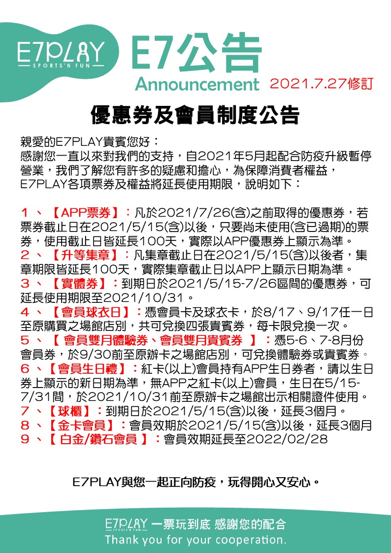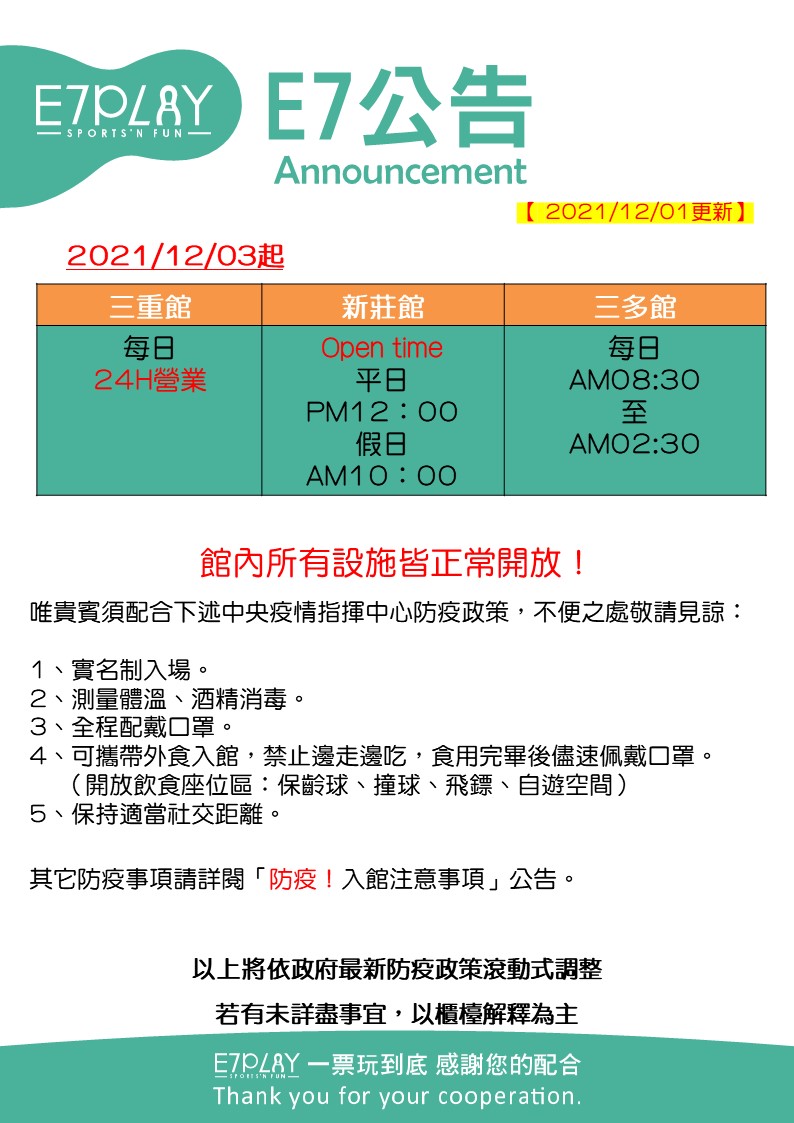 建議您來館前先用【E7PLAY APP】預約球道(入館),可減少您現場等候時間。惟防疫警戒期間,因加強設施清消作業,故預約將視現場人流進行調整,恕無法保證能如期給予球道,如遇特殊情事,E7將保有調整變更預約內容的權利。