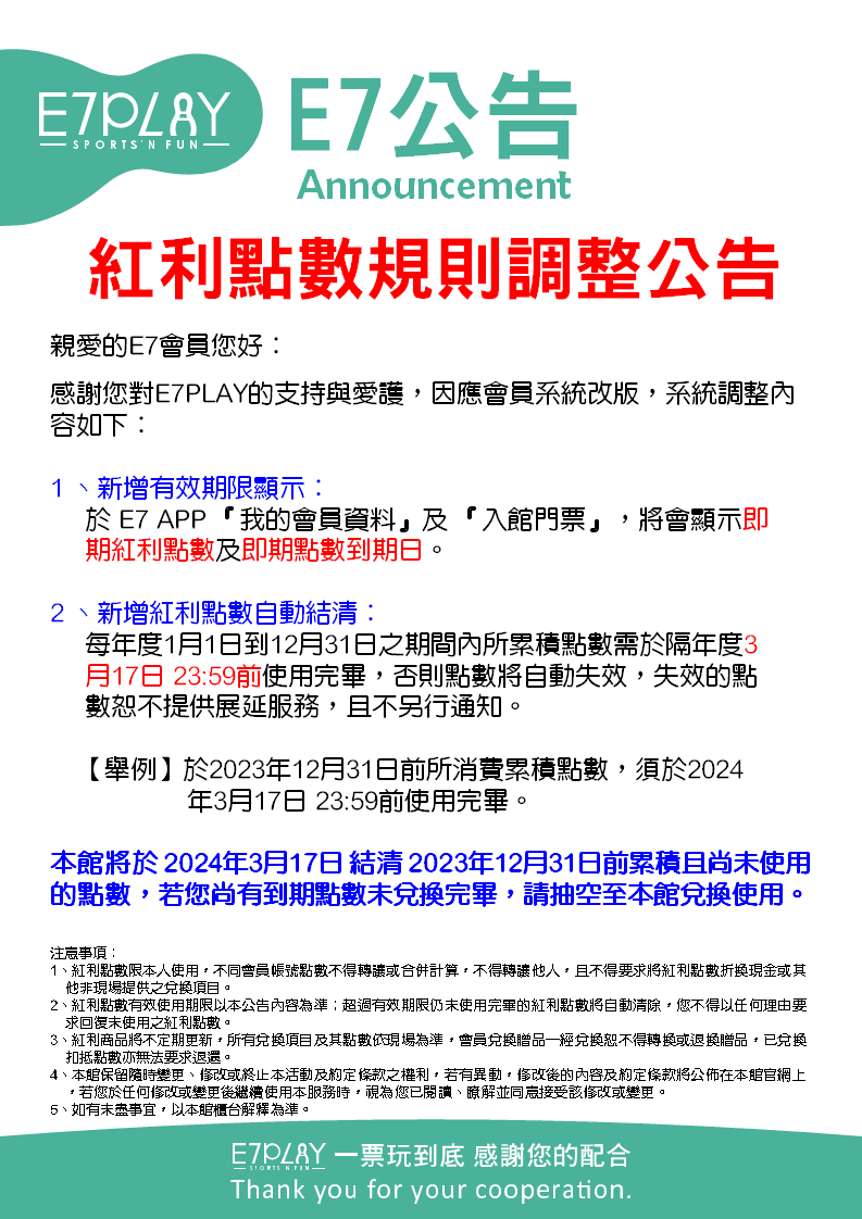 因應會員系統的改版,會員卡的紅利點數將新增「有效期限」與「到期日」的設定,調整內容詳見下圖公告說明!