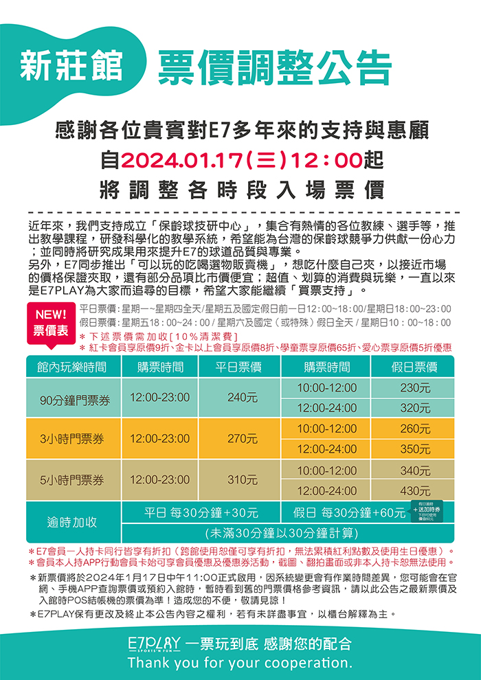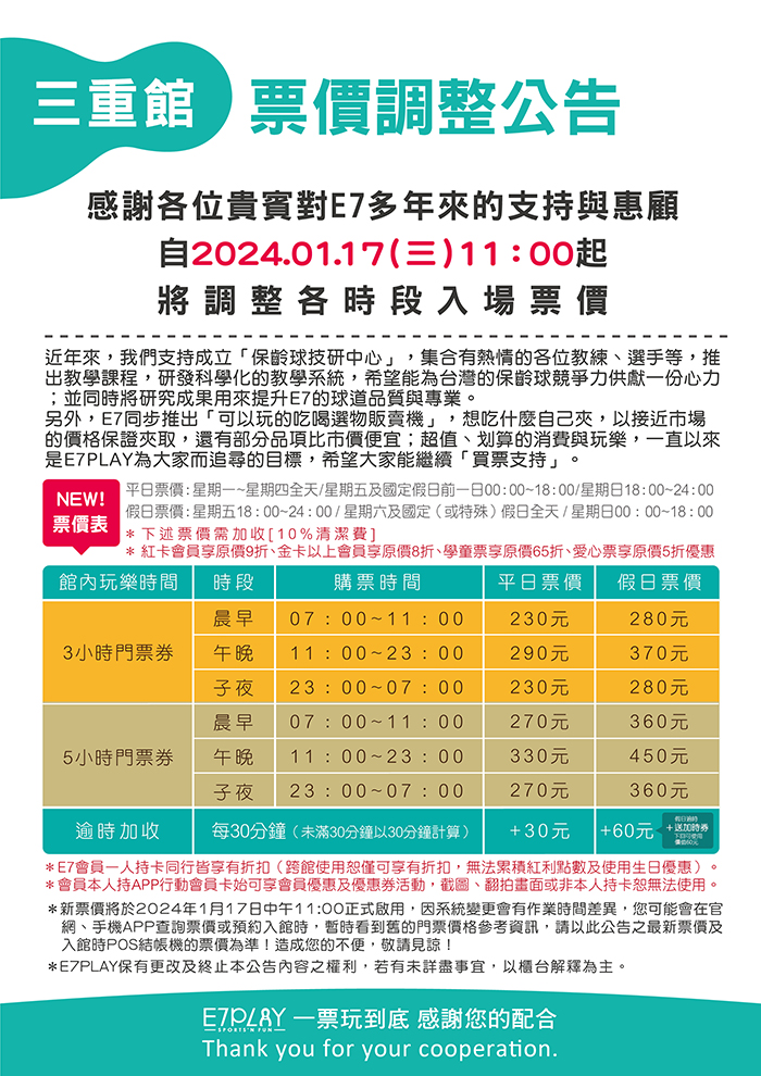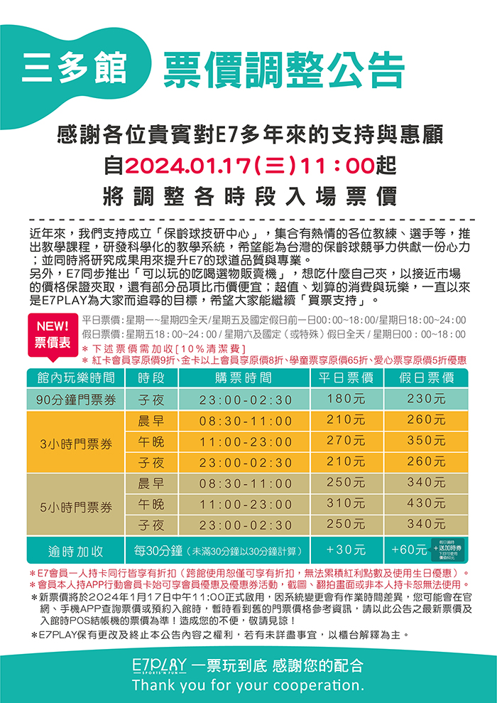 同時,為更好的照顧E7的夥伴,我們「近來每年調升夥伴薪資」,另一方面也面對到「各項成本」的不斷增加;E7將調整票價,敬請「買票支持」。