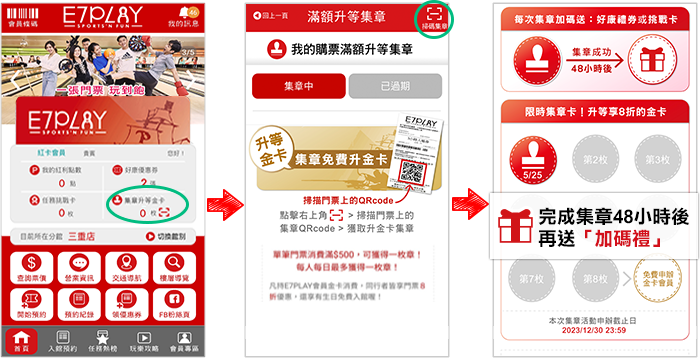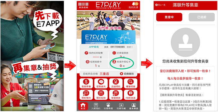 ★ E7紅卡會員:持本人紅卡單筆門票消費滿$500元,可用App掃描門票上的QRcode就能獲得乙枚集章!每人每日最多獲得一枚章。只要在7個月內集滿8章,就能免費升等E7金卡會員。每次集章成功的48HR後,App還會收到加碼小禮喔!