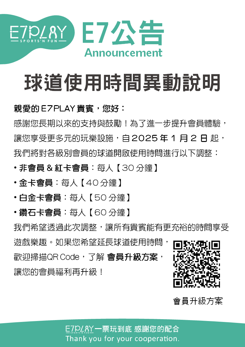 | 若遇滿道時,館內廣播會告知「恕不加時間」,但您仍可於下球道後,持門票再去櫃檯重新預約球道喔!等侯時請先使用其他館內玩樂設施,當輪到您的保齡球預約號碼時,櫃台將廣播通知您再次上球道打球喔!球道滿道或假日票價時段,4人(含)以上方可使用交換道(即2個球道),如來賓超過10分鐘未上場打球,本館有權將球道讓與其他貴賓喔! | |||