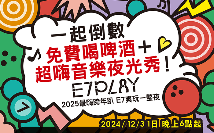 ★ 夜光保齡球 撞出金瓶大好運,整年都燦爛 E7保齡球活動可是自帶夜店感,跨年夜玩更有感,霓虹燈閃耀繽紛,螢光效果十足!邊打保齡球邊感受音樂律動,真是超級酷炫!不管是打卡拍照的必去景點,洗溝無所謂,重點是每張照片、每段限動都超好看,朋友圈肯定大讚!★ 樂透金瓶大贏家 精心安排在特定時間,球道出現金球瓶,只要球道上獨留金瓶不擊倒,即為挑戰成功,馬上獲得幸運抽抽樂乙次。![]() ★熱門遊戲機挑戰機 陪跨年,明年一定贏 百萬新機已開放,遊戲機台免投幣暢玩~跨年夜還舉辦互動挑戰賽,邀你和好友一起拿大獎,玩出新高度,笑聲不斷,回憶滿到2025。![]() ★ 好夾幣 好手氣 唱好歌 歡樂到明年 買門票附送兩枚「好夾幣」讓你挑戰:0元夾零食!E7好夾多保夾最低$10起;超方便的K歌亭,不用等成團想唱就唱,展現歌喉!跨年夜購買5H 方案加碼歡樂多送 【好夾幣】、【一起玩購物袋】#送完為止 ![]() ★ APP線上預約 比別人更早開玩 想去E7玩一波,吹冷氣打保齡球,可是會不會都要排隊等很久...E7APP免費下載,加入會員即可線上預約,節省各位的排隊等候時間。 除了入館預約之外,還有查詢票價、集章升等會員(免費)、會員專屬優惠券喔!