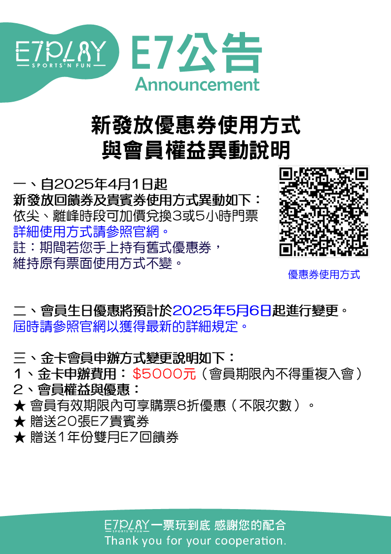 為提供更優質的服務,E7PLAY 將自 2025 年 4 月 1 日起,調整部分優惠券使用方式及會員制度內容。 請您詳閱以下說明,並依官網最新公告為準。
