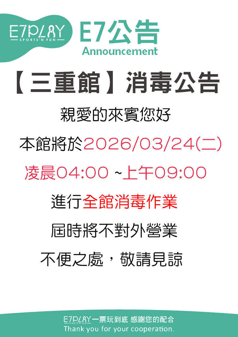 本館將於 03/24 (二) 04:00-09:00 進行全館消毒作業,