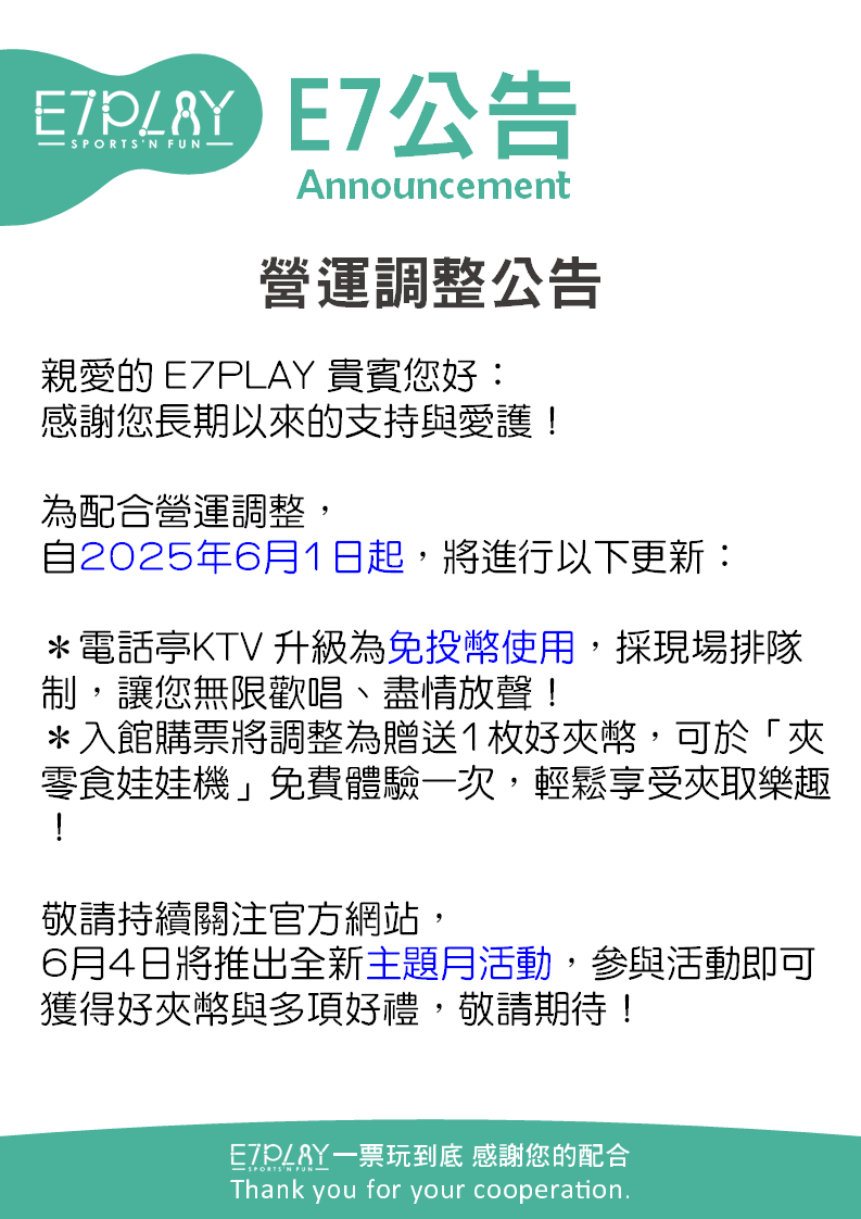 E7PLAY 的好朋友們: 我們有好消息要和大家分享啦!6 月起,不只歡唱免投幣,還有全新「主題月活動」同步登場~ E7 全新玩法、更多歡樂,等你一起來開嗨!