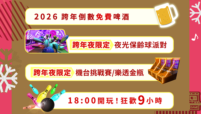 2026跨年限定好禮:購票滿額 送 獨家商品 跨年活動期間,購買門票滿$1200元,即贈送【GO PLAY手機掛繩】(市價$149)!這款商品限量、館內獨家、外面買不到!![]() 《《《 E7跨年夜 #必玩 亮點盤點》》》 亮點1|2026 跨年倒數免費啤酒 跨年夜限定加碼!每人免費領取一瓶罐裝啤酒,與朋友一起倒數喊出 5-4-3-2-1,迎接新年的最高潮時刻。 亮點2|夜光保齡球 霓虹跨年最吸睛 E7 夜光保齡球自帶夜店氛圍,跨年夜更嗨:霓虹燈、螢光球道、節奏音樂,怎麼拍都好看!怎麼玩都好嗨。