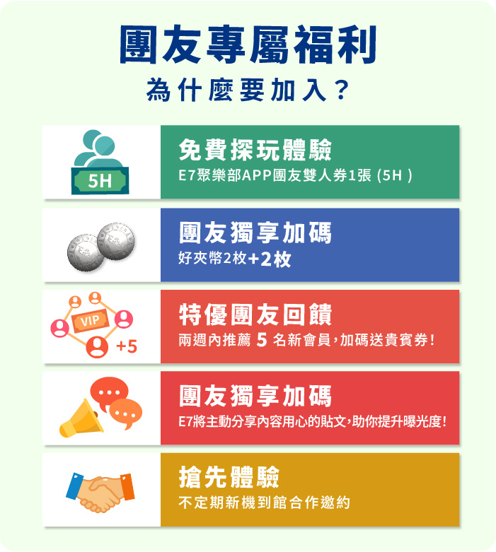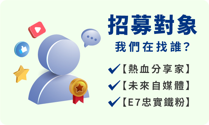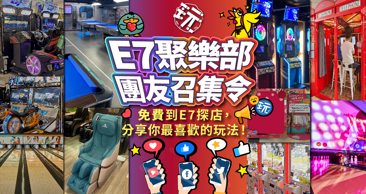 你就是那個擁有「好地方雷達」的玩樂達人嗎? 你的親友粉絲總愛追隨你推薦的腳步? E7聚樂部成立啦!正式發佈「團友召集令」!我們正在尋找愛玩、愛分享的你,【免費玩樂招待】 與【團友限定獨家禮遇】!讓你搶先免費體驗 E7 的最新機台與活動,分享你的玩樂攻略!帶上親友粉絲一起狂歡,擴大你的社群影響力!