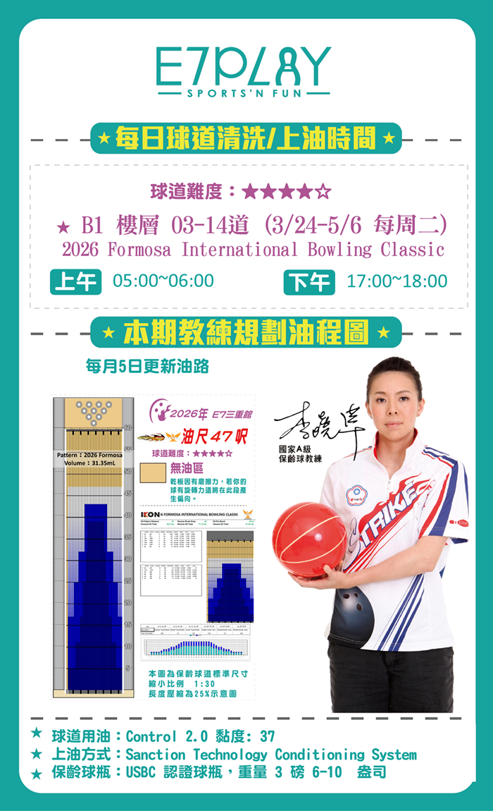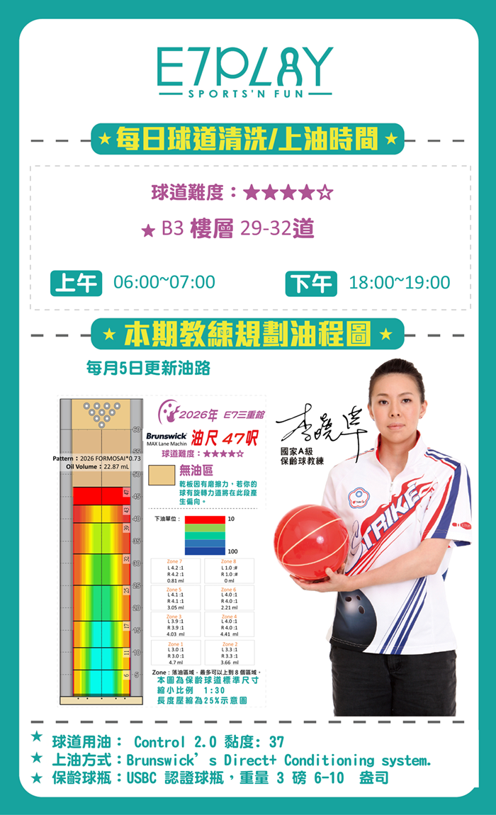 【三重店】2026年04月份「每日球道清洗/上油時間」及「油程圖」如下,請您參考!