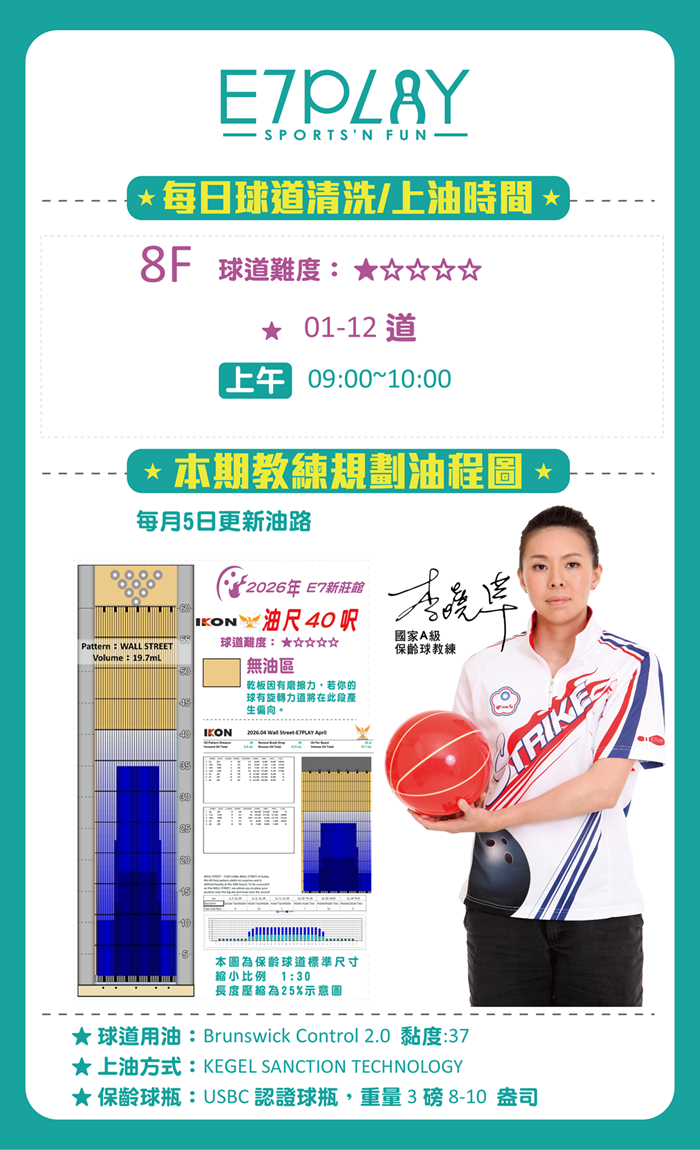 【新莊店】2026年04月份「每日球道清洗/上油時間」及「油程圖」如下,請您參考!