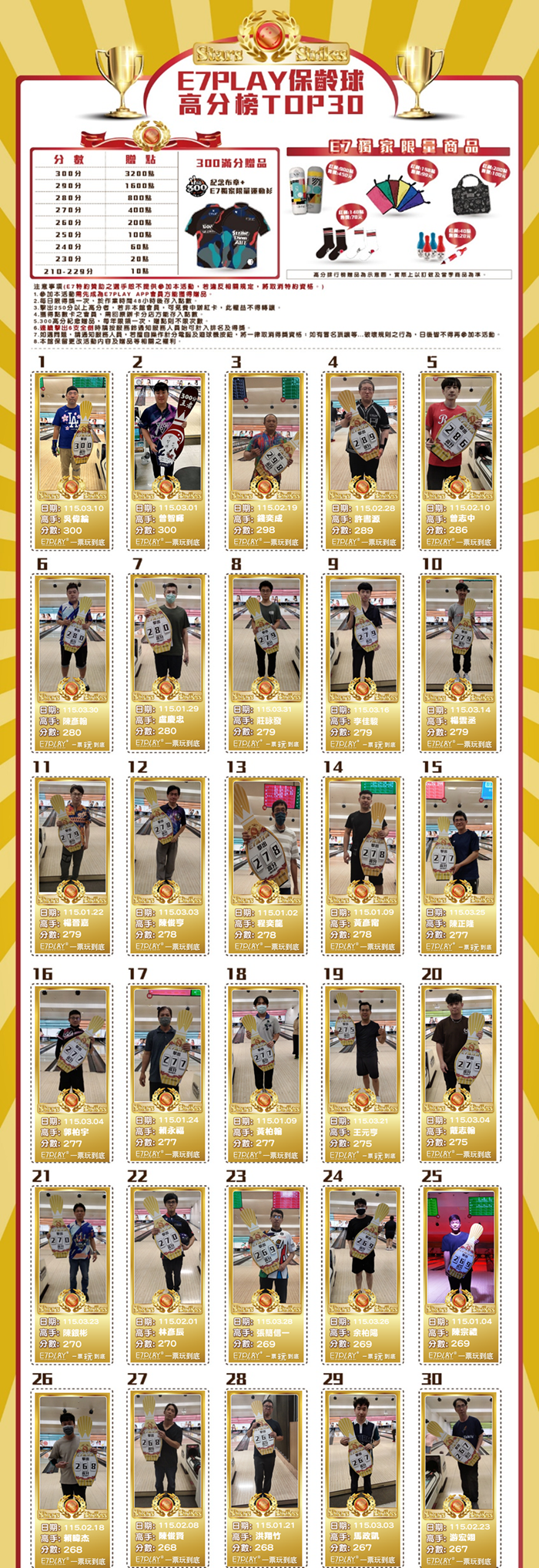 隱藏民間的保齡球高手,不時出沒在你的身邊,記得幫他們加加油喔! 凡擊出230以上高分,即可獲得E7卡的紅利點數!歡迎各路好手一起來E7挑戰~~~~
