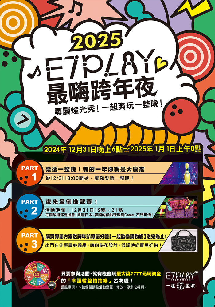 親愛的E7PLAY朋友您好,非常感謝您對E7PLAY的支持與愛護, 本館將於2024.12.31 PM 6:00~2024.12.31 PM 12:00進行「2025跨年活動」, 此期間內所有優惠券均暫停使用,造成您的不便,敬請見諒。 進館前現場購買門票、依人頭計費,可選擇進館90分鐘、3小時或5小時的玩樂時間喔! 以下票價皆含有無限暢飲費用!!!