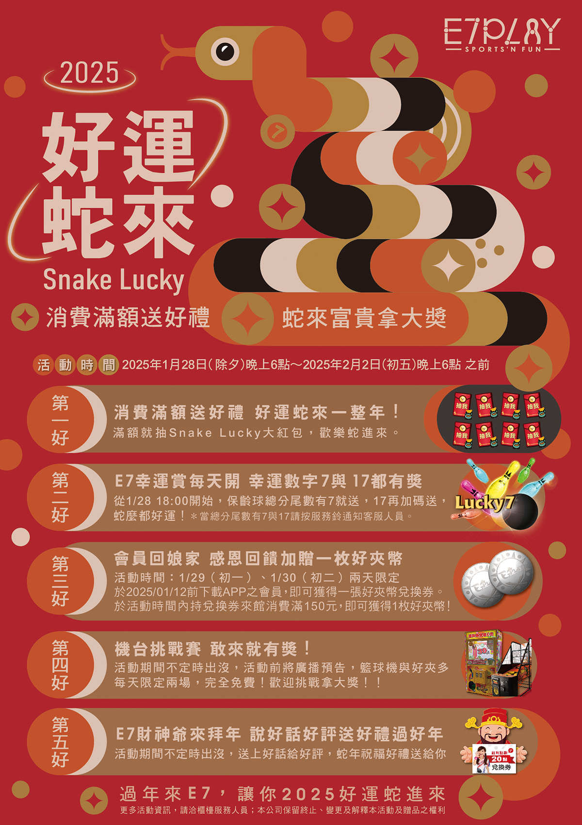 親愛的E7PLAY朋友您好,非常感謝您對E7PLAY的支持與愛護, 本館將於2025年1月28日(除夕)晚上6點~2025年2月2日(初五)晚上6點之前 進行「2025 Snake Lucky好運蛇來春節活動」, 此期間內所有優惠券均暫停使用,造成您的不便,敬請見諒。 進館前現場購買門票、依人頭計費,可選擇進館3小時或5小時的玩樂時間喔!