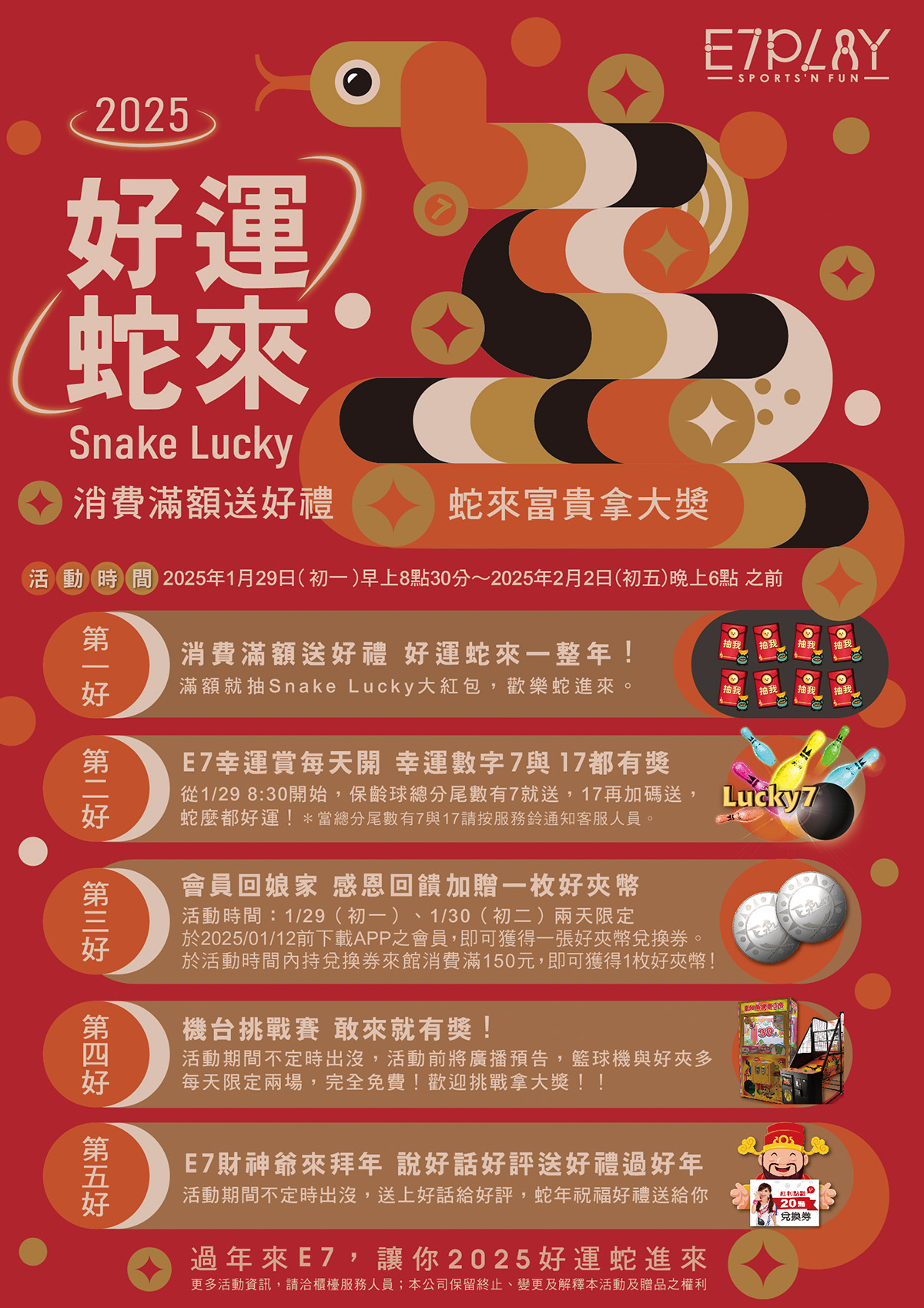 親愛的E7PLAY朋友您好,非常感謝您對E7PLAY的支持與愛護, 本館將於2025年1月29日(初一)早上8點30分~2025年2月2日(初五)晚上6點 之前 進行「2025 Snake Lucky 好運蛇來 春節活動」, 此期間內所有優惠券均暫停使用,造成您的不便,敬請見諒。 進館前現場購買門票、依人頭計費,可選擇進館3小時或5小時的玩樂時間喔! 以下票價皆含有無限暢飲費用!!!