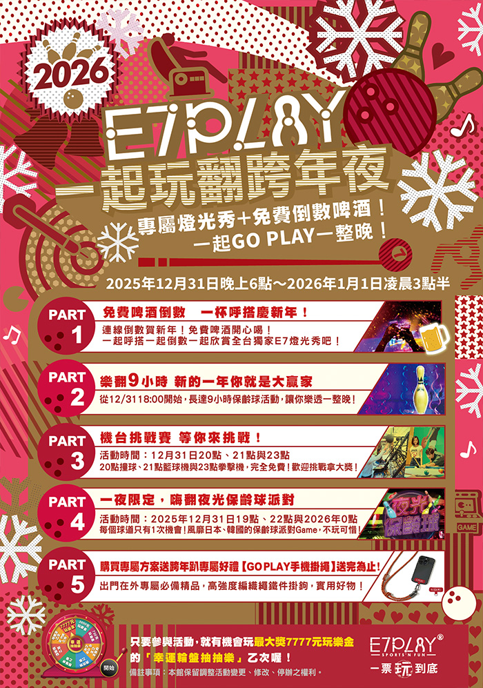 親愛的E7PLAY朋友您好,非常感謝您對E7PLAY的支持與愛護, 本館將於2025.12.31 PM 6:00~2026.1.1 AM 3:30進行「2026跨年活動」, 此期間內所有優惠券均暫停使用,造成您的不便,敬請見諒。 進館前現場購買門票、依人頭計費,可選擇進館90分鐘、3小時或5小時的玩樂時間喔! 以下票價皆含有無限暢飲費用!!!